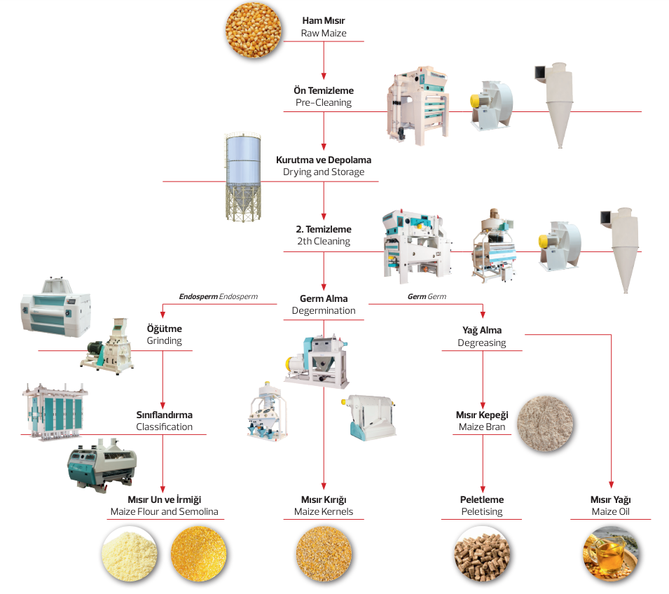 Hasatı yapılan mısır işlenmek için tesislere götürülür ve çeşitli proseslerden geçer. Bu prosesler sırasıyla;